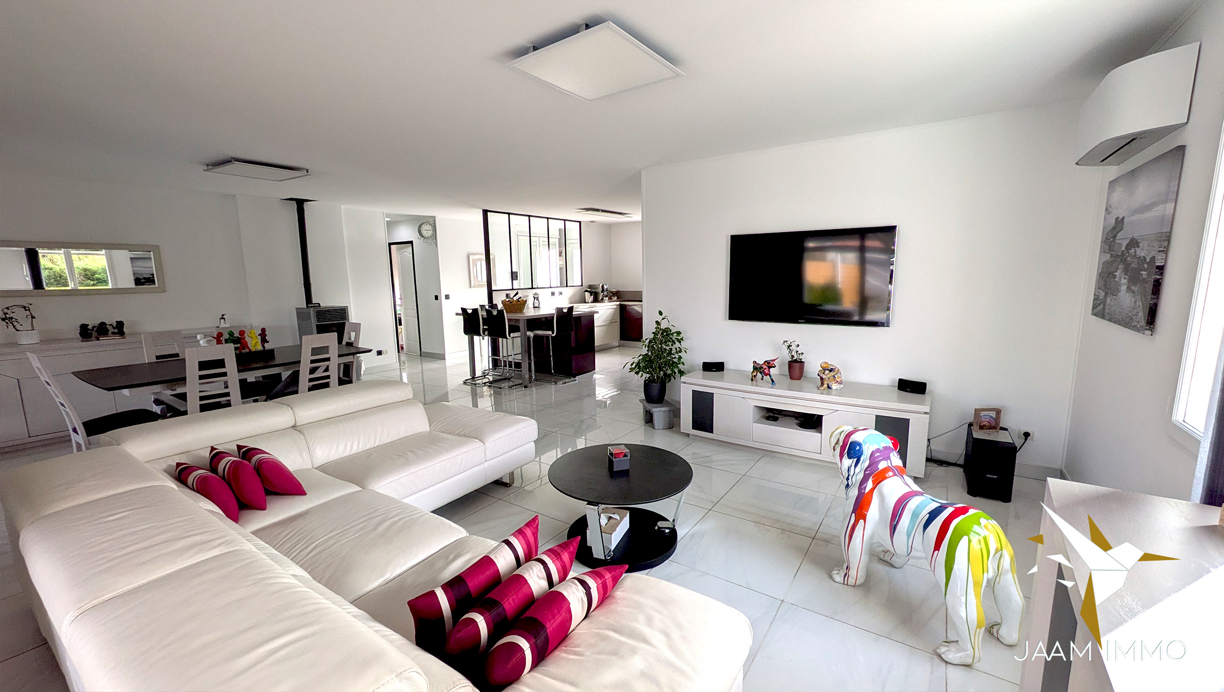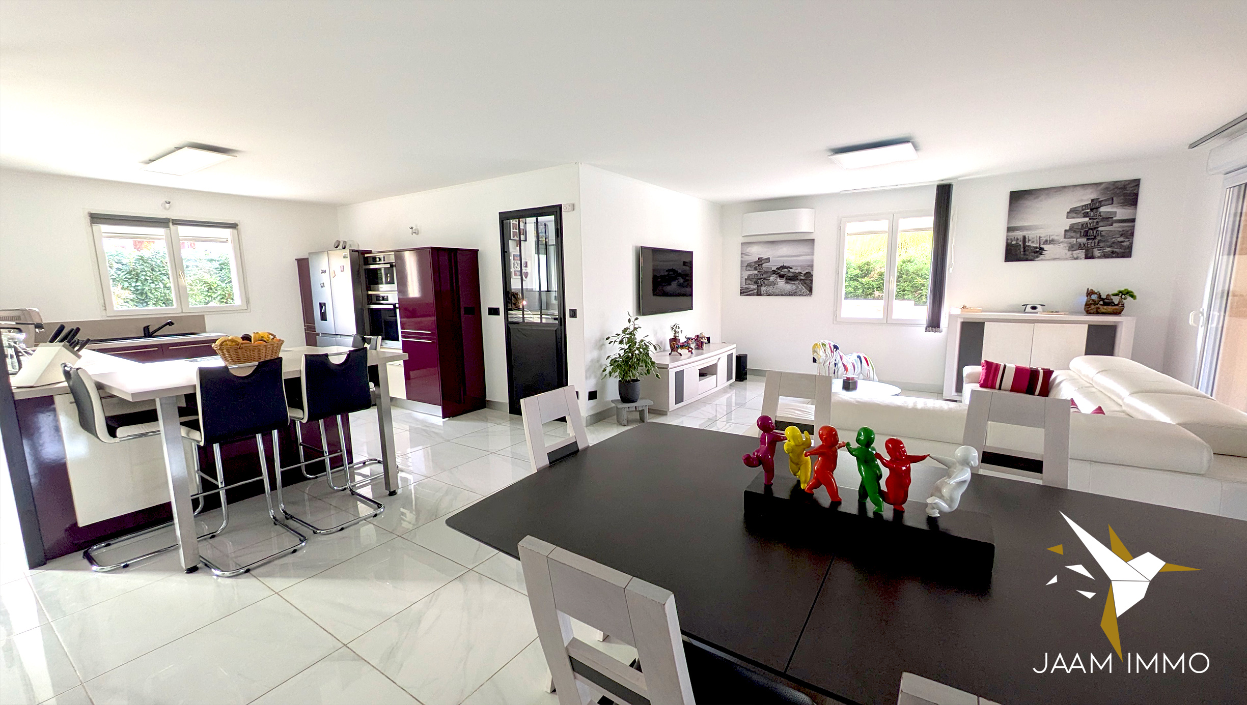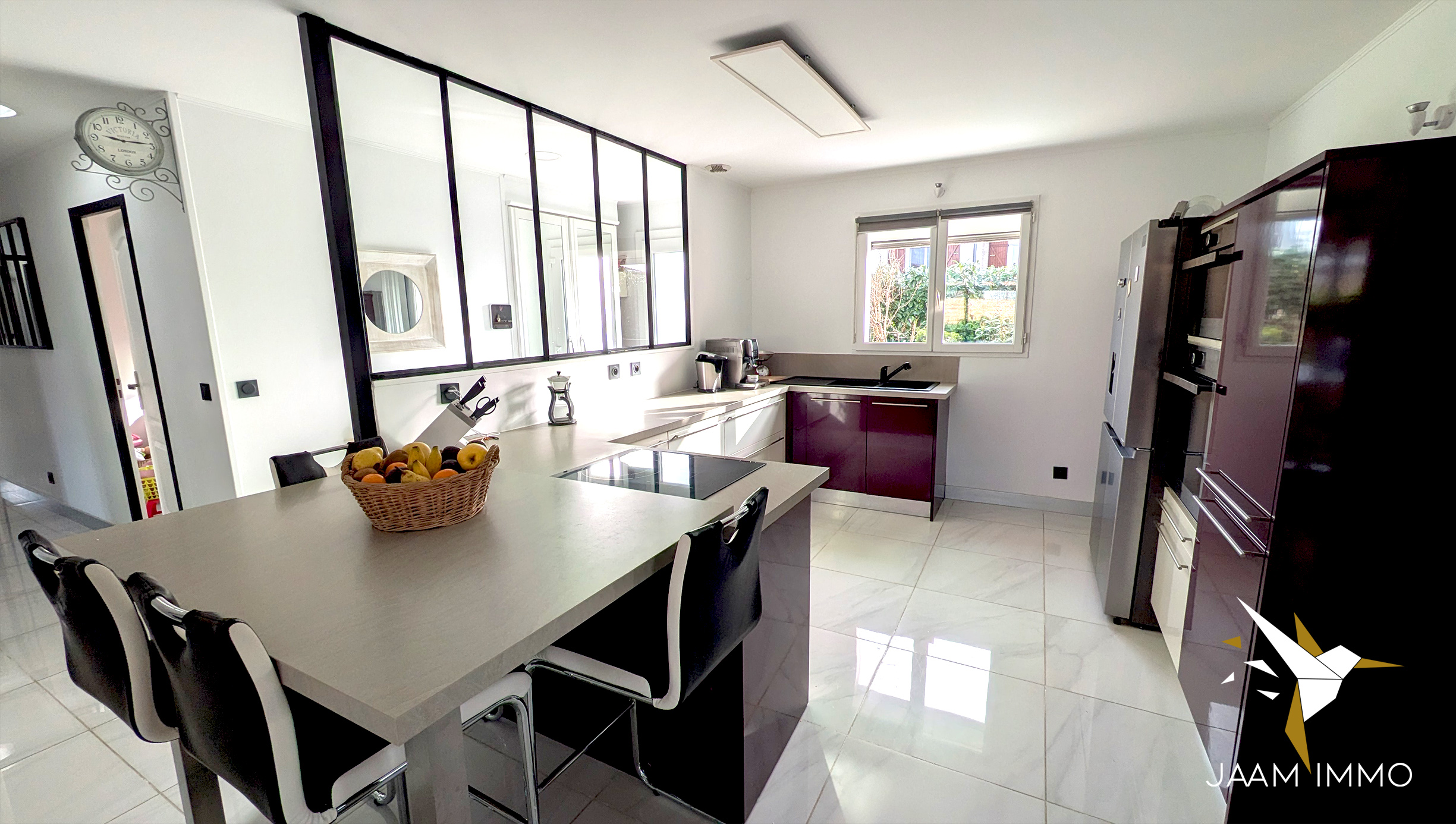 A l’intérieur vous serez immédiatement séduit par son aménagement et ses volumes : 164 m2 entièrement de plain-pied comprenant une grande pièce de vie avec cuisine ouverte, 3 chambres dont une suite parentale avec salle d’eau, un bureau, une salle de bains et une extension de 28 m2 pouvant faire office de 4ème chambre (voir 5ème), salle de jeux ou autre. La maison comprend également 2 WC et une buanderie.